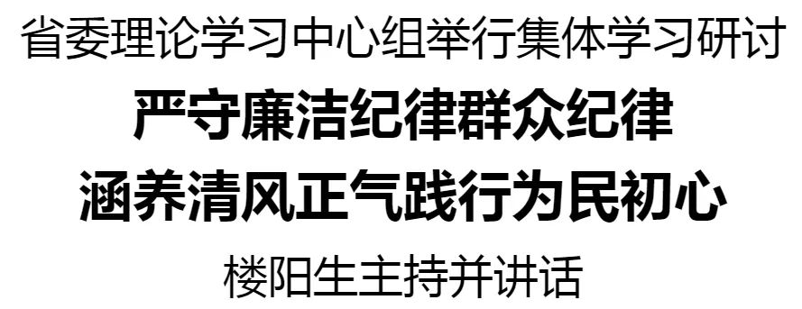 6月7日,省委理論學習中心組舉行集體學習研討,繼續深入學習《中國共產黨紀律處分條例》,重點圍繞廉潔紀律、群眾紀律進行研讀。省委書記樓陽生主持并講話。