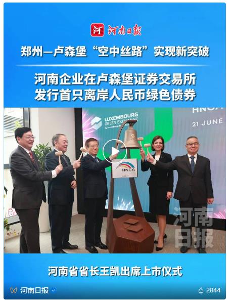 當地時間6月21日上午,中豫航空集團以河南航投為主體發行的3年期人民幣境外債券上市儀式在盧森堡證券交易所舉行。這是中國企業在歐洲發行的首只支持可持續航空燃料(SAF)的綠色債券,也是河南企業發行的首只離岸人民幣綠色債券,鄭盧“空中絲路”資金融通實現新突破。