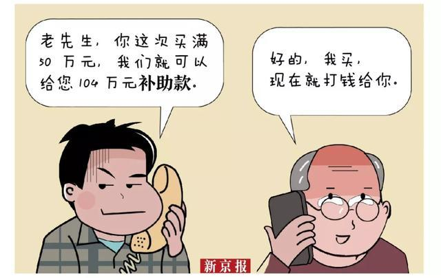 案例:70歲的劉某接到一個“保健專家”的電話,經(jīng)忽悠,劉某買了一萬多元的保健品。然而,對方又稱只要購滿50萬元,即可獲得補(bǔ)助款104萬元。當(dāng)劉某真的購買了遠(yuǎn)超50萬元的保健品后,那個從未謀面的專家再也聯(lián)系不上了。