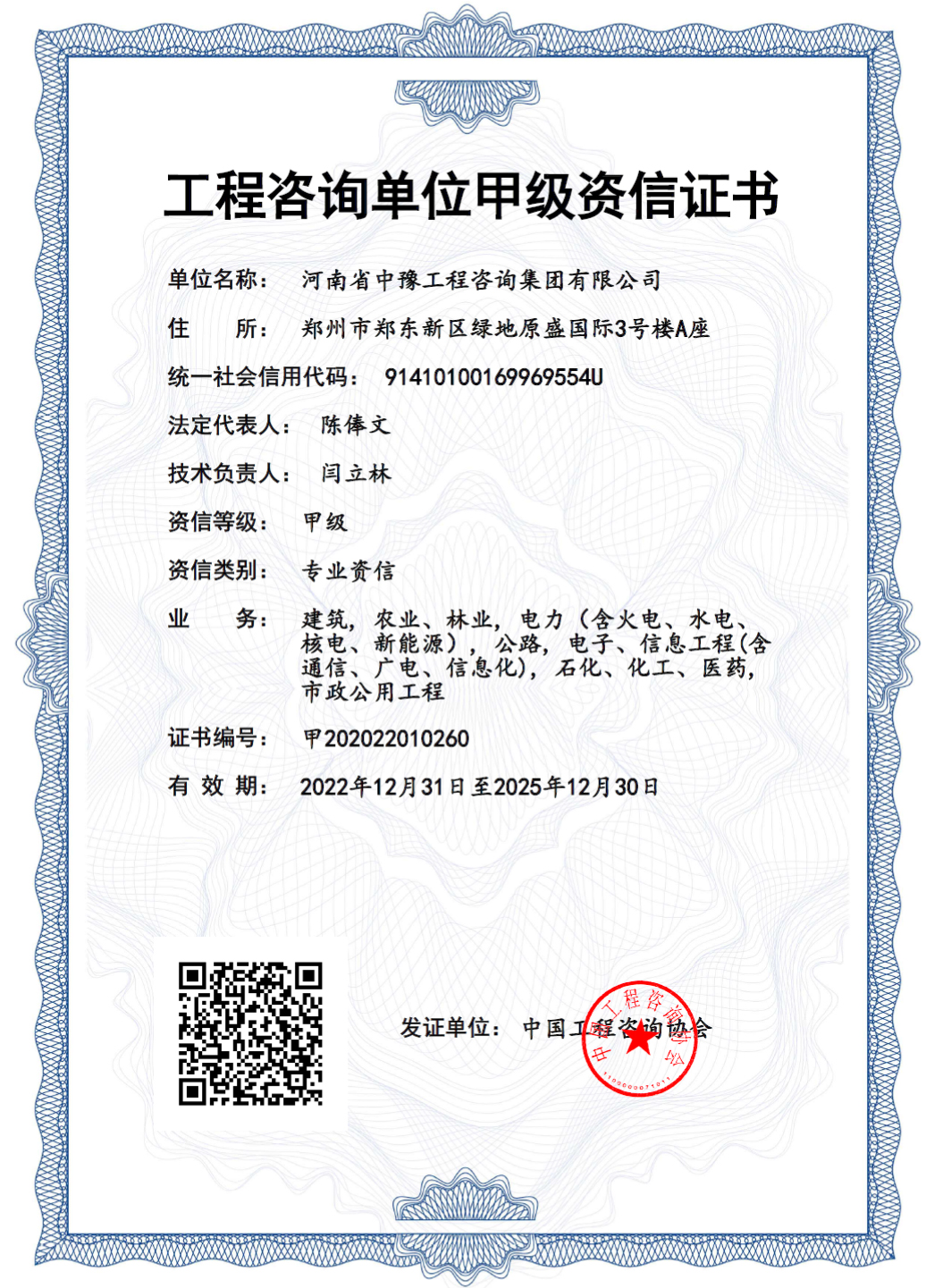 工程咨詢資信等級是衡量工程咨詢企業綜合實力的重要標志,也是工程咨詢企業發展的重要基石。甲級綜合資信可以作為所有專業規劃咨詢和評估咨詢業務能力的參考。目前,中豫咨詢集團已獲得工程咨詢單位甲級綜合資信和7個甲級專業資信,企業綜合實力邁上新臺階。
