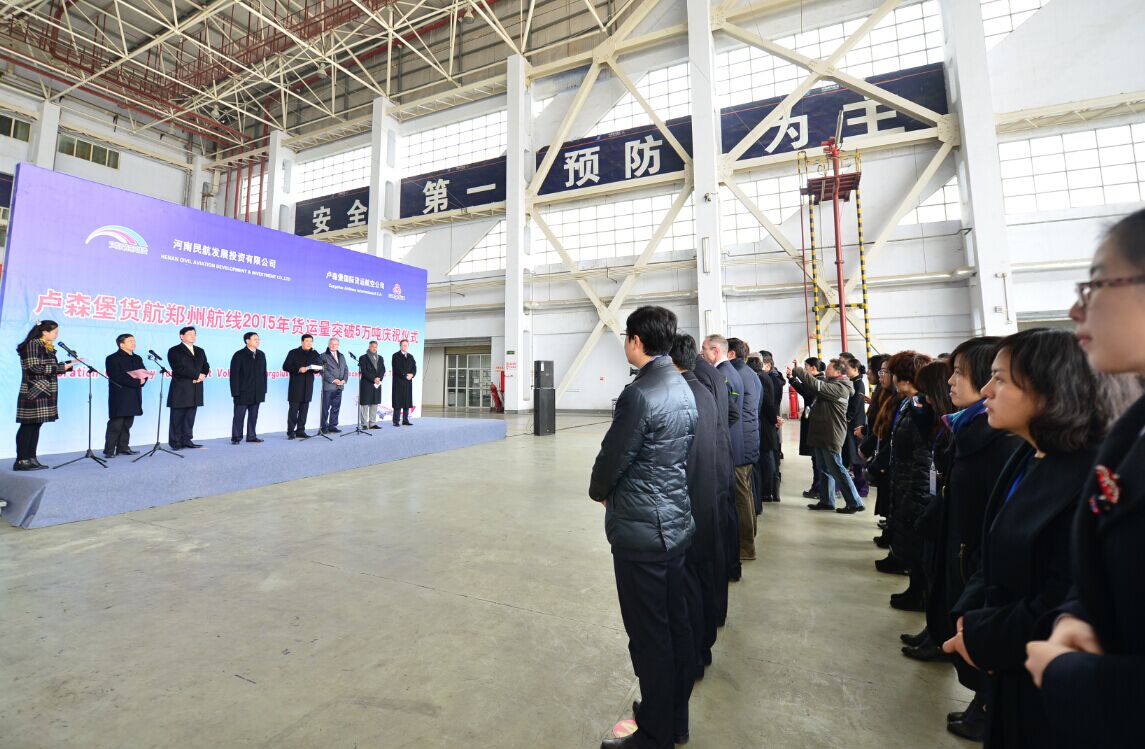 當天中午,河南民航發展投資有限公司與盧貨航聯合在鄭州機場舉行了簡短熱烈的慶祝儀式。河南省副省長趙建才出席儀式并致辭,盧森堡駐華大使石泰嵋宣讀盧森堡可持續發展與基礎產業部部長弗朗索瓦?鮑施的賀信,省政府副秘書長張雷明主持儀式。省直單位有關負責人親臨現場。河南航投董事長、黨委書記張明超,總經理、副董事長、黨委副書記劉建葆,公司領導悅國勇、鄭立亮、郭艷紅以及盧貨航董事會主席保羅?海明格、盧貨航總裁兼CEO德克?李奇同時參加儀式。