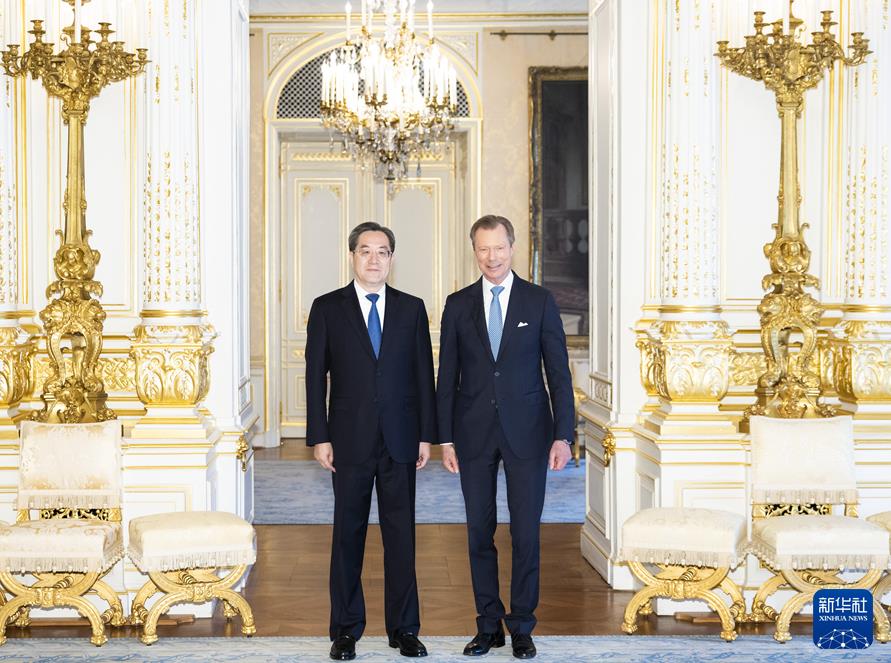 6月20日至21日,中共中央政治局常委、國務院副總理丁薛祥訪問盧森堡,分別會見盧森堡大公亨利、國民議會議長維斯勒、首相弗里登、副首相貝泰爾,出席第二屆鄭州-盧森堡“空中絲綢之路”國際合作論壇并致辭。這是6月20日,丁薛祥會見盧森堡大公亨利。新華社記者 黃敬文 攝