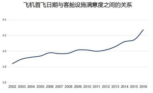 上圖是飛機首飛日期與客艙設(shè)施滿意度之間的關(guān)系,可以看出首飛日期越近滿意度越高,首飛日期越早滿意度越低,而且是持續(xù)地降低。“也就是說我們?nèi)说男枨笤谧兓覀兊酶先说男枨笞兓P袠I(yè)的標準是持續(xù)的在升級的,我們需要往前追趕。”